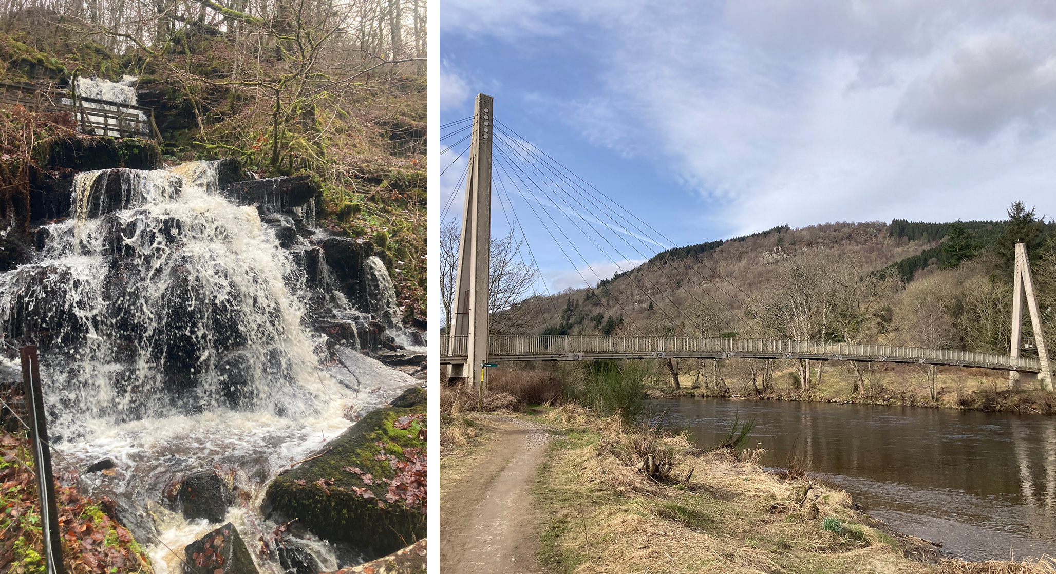 Download the app, which is free and the walk may be downloaded to your phone for £5.99 . After that all you will need is your fully charged up phone, your headphones and a sense of adventure. The app uses the GPS on your phone to deliver the information at the right time and place. You’ll start near the High Street and finish just beyond the Moness Falls and meanwhile your guide will keep you amused bedazzled and informed. Along the way you will view the important sites of the town, cross Wades Bridge and visit the immense Aberfeldy waterwheel.